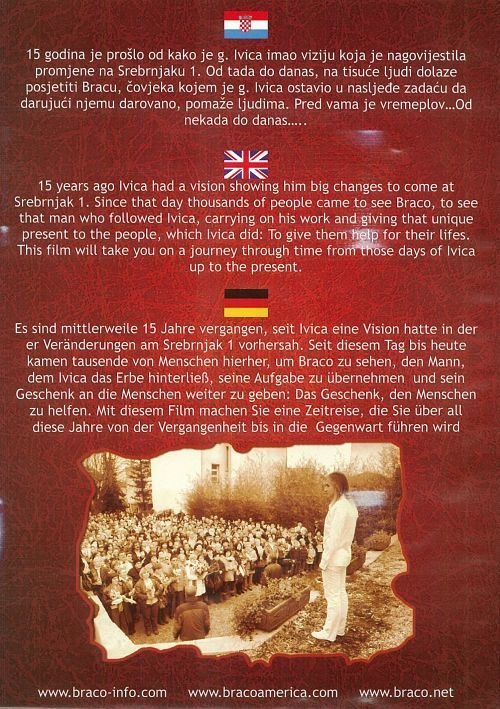 15 years ago Ivica had a vision showing him big changes to come at Srebrnjak 1. Since that day, thousands of people have come to see Braco, to see this man who followed Ivica, carrying on his work and giving that unique gift to the people as Ivica had done – giving help for their lives. This film will take you on a journey through time from the days of Ivica up to the present.