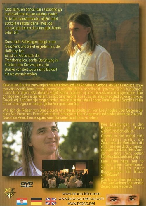 Braco's journey expands into America, from Los Angeles, to Sedona, to San Francisco, he draws together the threads of ancient energies, weaving them with the present, connecting them to the future. Thousands from all over the US came to see Braco, and the stories of their experiences are extraordinary. Though he does not call himself a healer, the testimonies of those who have been embraced by his gaze suggest otherwise. A man who hasn't walked for 3 years walks from the session up the stairs and out, a woman's brain tumor of 15 years vanishes, another helps her husband’s Parkinson’s Disease.